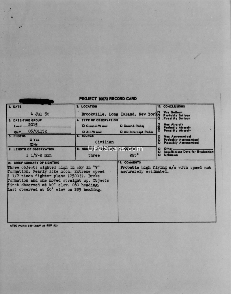 A civilian reported three circular objects in formation over Long Island on July 4, 1960. The Air Force concluded they were likely high-flying aircraft.