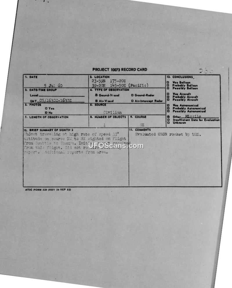 A Northwest Airlines pilot reported a UFO sighting on July 5, 1960, over the Pacific. The US Navy evaluated the object as a Soviet rocket.