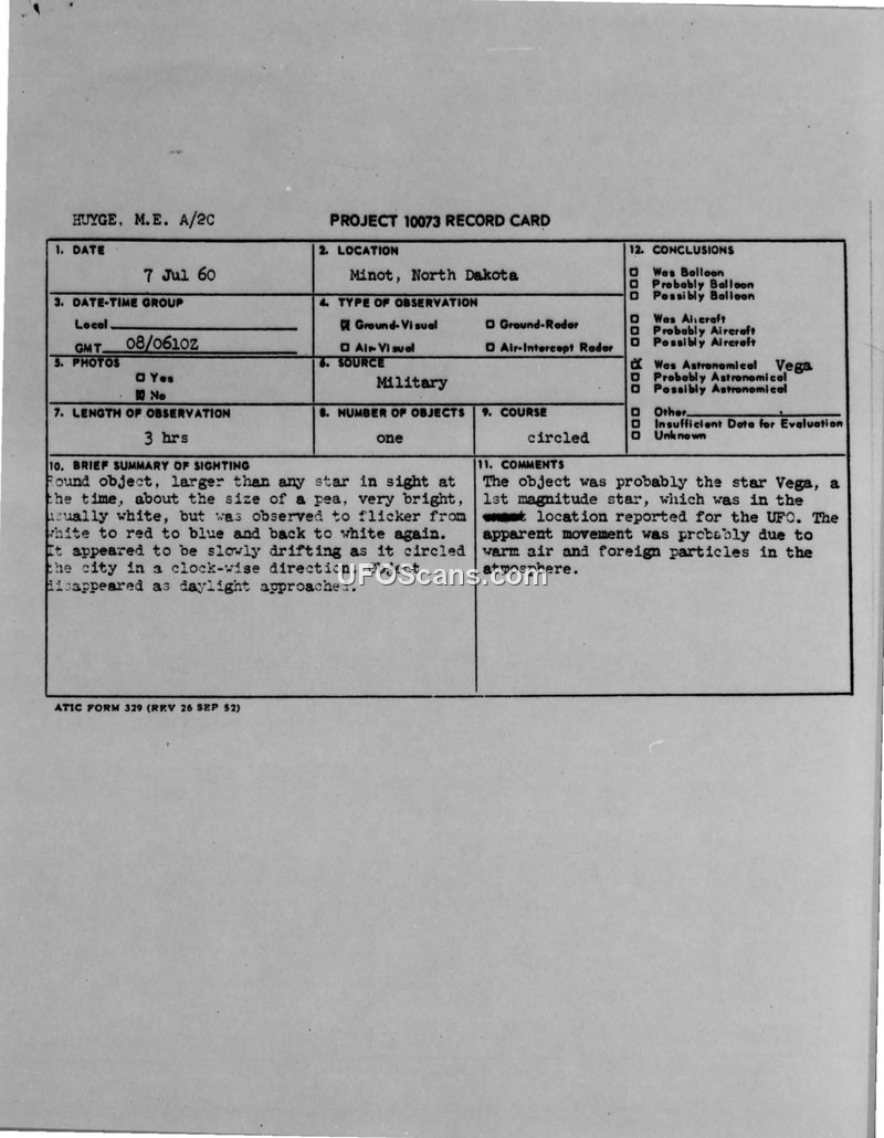 On 7 July 1960, Airman Second Class M.E. Huyge of the 32nd Fighter Group at Minot Air Force Base reported a sighting of an unidentified aerial object. The observation lasted approximately three hours, beginning at 0610Z. The witness described the object as round, larger than any star in sight, and roughly the size of a pea held at arm's length. The object was observed to be very bright and white, but it flickered between white, red, and blue. It appeared to drift slowly while circling the city of Minot in a clockwise direction at an elevation of 75 to 85 degrees. The object disappeared as daylight approached. Following the report, the 786th ACWRON initiated an investigation, which included increased radar surveillance and inquiries to local and regional air traffic control centers, including Minot FAA, Minneapolis ARTC, and Winnipeg ARTC. No radar contacts were made, and no other reports were received by the radar sites, although the Minot AFB switchboard operator noted that several calls had been received regarding the sighting. An investigator from the base also went outside to observe the sky and reported seeing an unusually bright star, but noted no movement during a twenty-minute observation period. The official conclusion reached by the Air Technical Intelligence Center (ATIC) was that the object was the star Vega. The reported movement and flickering were attributed to atmospheric conditions, specifically warm air and foreign particles in the atmosphere. The report notes that it was considered doubtful that a genuine object could remain in the vicinity of a radar site for three hours without being detected by radar if it were near the earth.