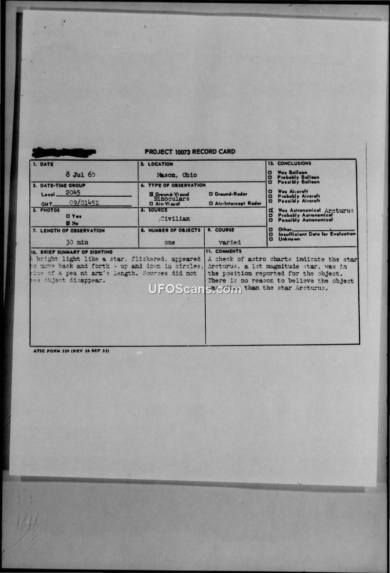 A civilian reported a flickering light in the sky over Mason, Ohio, on July 8, 1960. The Air Technical Intelligence Center concluded the object was the star Arcturus after checking astronomical charts.