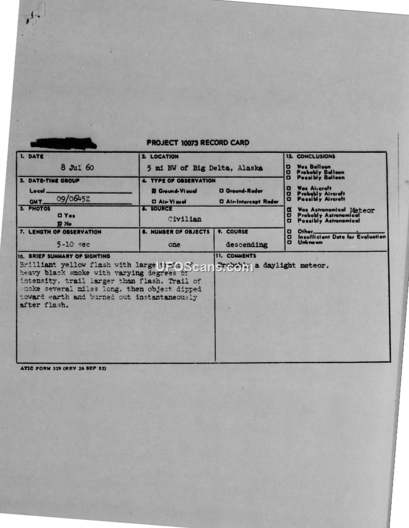 Project 10073 Record Card — Big Delta, Alaska, 8 July 1960