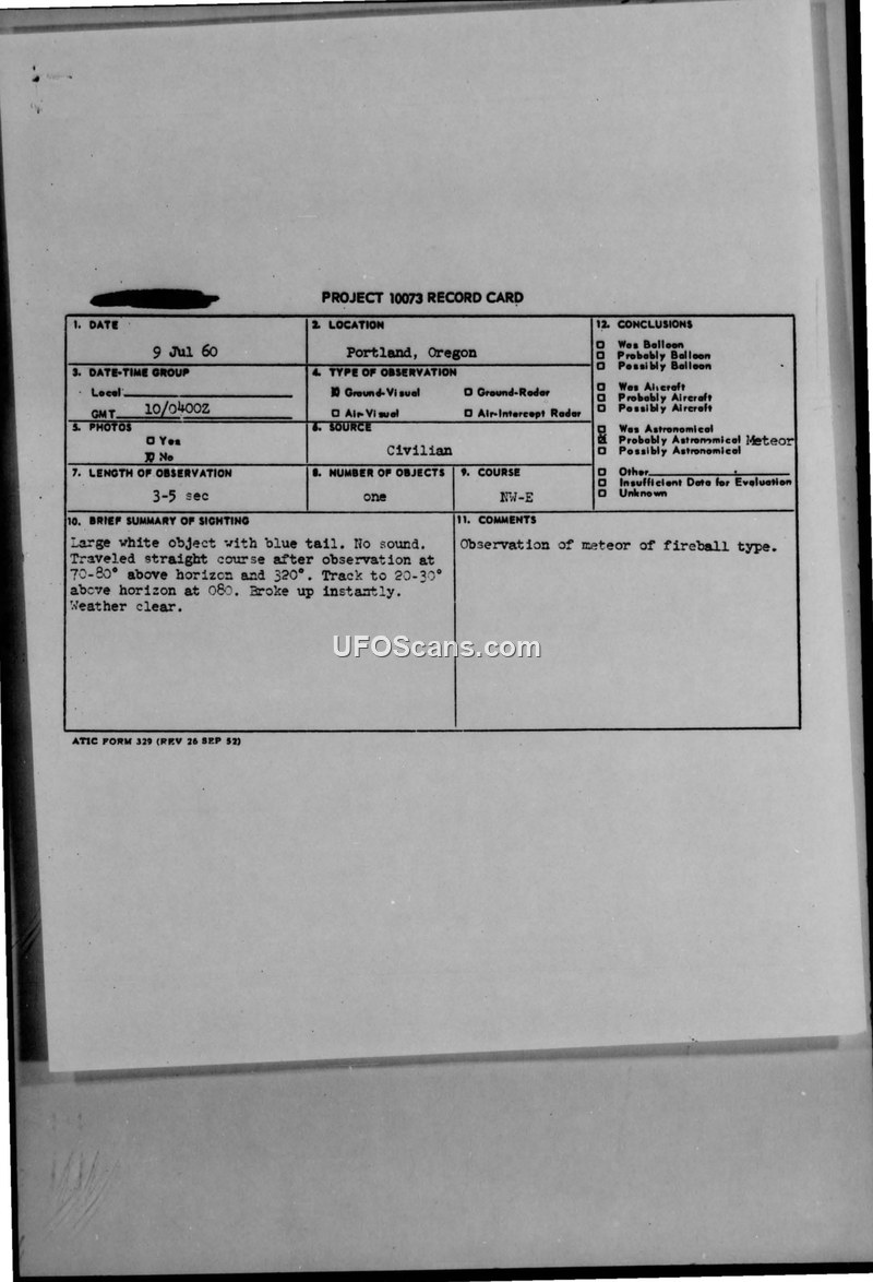 This document contains two Project 10073 record cards and associated military teletype reports regarding UFO sightings in Portland, Oregon, in July 1960. The first incident, occurring on 9 July 1960, involved a single large white object with a blue tail observed by a witness described as reliable. The object was seen traveling from the northwest to the east, moving from 70-80 degrees above the horizon to 20-30 degrees before breaking up instantly. The official conclusion for this event was that it was a meteor of the fireball type. The second incident, reported on 14 July 1960, involved four round objects, with sizes estimated between 6-7 inches and 13-14 inches in diameter. The witness, a woman, reported the objects traveling in a straight line from north to south for approximately 60 seconds before disappearing. The Air Technical Intelligence Center (ATIC) and the reporting officer, Captain Eugene G. Smith, classified this report as unreliable, citing a lack of corroborating witnesses and the witness's perceived unreliability. The document includes detailed teletype communications from the 337th Fighter Group at Portland International Airport to various Air Force commands, including the 25th Air Division and the Air Technical Intelligence Center at Wright-Patterson Air Force Base, documenting the specific details of these observations.