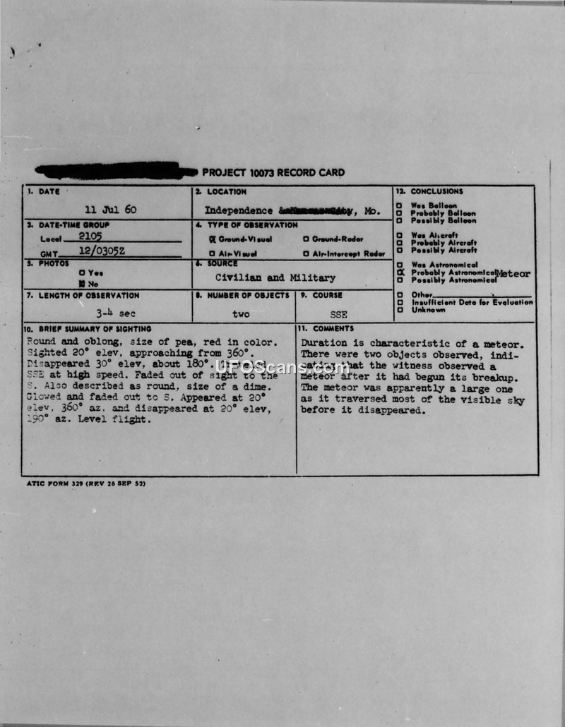 A July 1960 sighting of two glowing objects in Independence, Missouri, was investigated by the Air Force and officially attributed to a meteor breakup. Radar checks for aircraft in the area were negative.