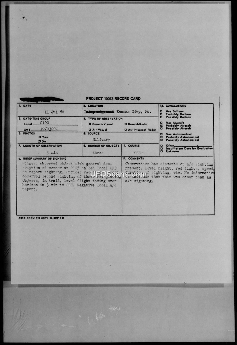 This document consists of a Project 10073 record card and subsequent military correspondence regarding a UFO sighting reported on July 11, 1960, in Kansas City, Missouri. The initial report describes a witness who observed an object resembling a meteor at 2105 local time, followed by a second sighting of three red glowing objects in trail, flying at a level altitude toward the SSE for approximately three minutes. The Air Technical Intelligence Center (ATIC) requested further investigation into the incident, specifically asking if the objects passed directly overhead, the duration of the sightings, and whether radar sites had been checked. In response, military personnel at Richards Gebaur AFB provided additional details, noting that the objects did not pass directly overhead but moved from 360 degrees to 190 degrees at a very high altitude. Witnesses reported varying durations for the sightings, ranging from three to four seconds to thirty seconds, and one witness reported a separate sighting lasting two to three minutes. The correspondence confirms that FAA and local radar installations were queried regarding aircraft in the area, and all reports returned negative results. Despite the lack of radar confirmation, the official conclusion recorded on the card states that the observation contained elements consistent with an aircraft sighting, such as level flight and red lights, and there was no evidence to suggest the objects were anything other than aircraft.