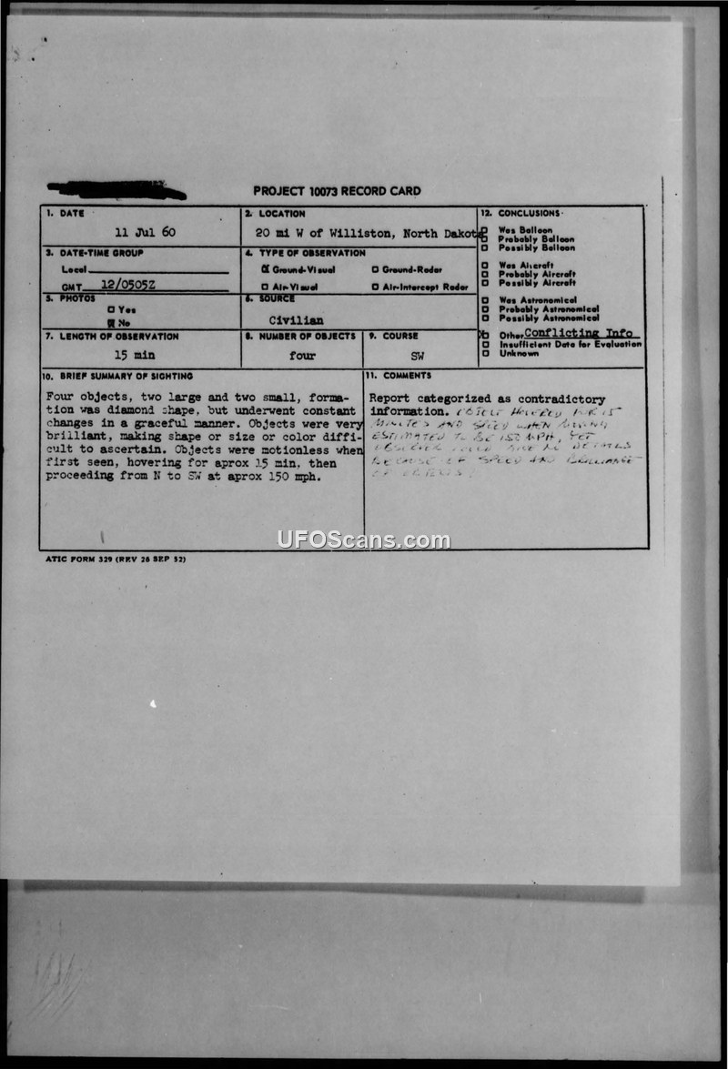 A report of four diamond-shaped objects observed near Williston, North Dakota, on July 11, 1960. The witness described the objects as brilliant and capable of constant formation changes, though the military investigation ultimately categorized the report as contradictory.