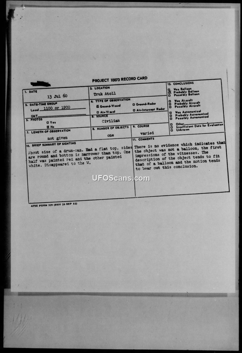 A civilian witness in the Truk District reported a red and white drum-shaped object on July 13, 1960. The USAF evaluated the report and concluded the object was likely a balloon.