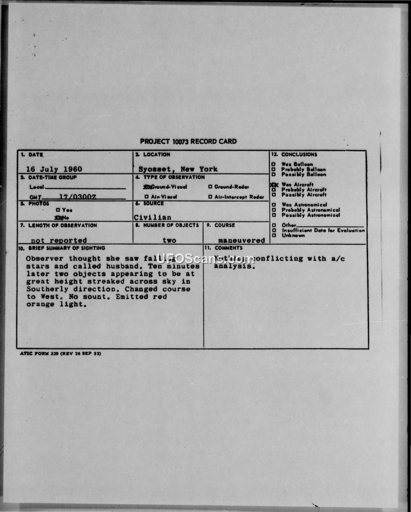 This document contains a Project 10073 record card and associated correspondence regarding an unidentified aerial phenomenon sighting in Syosset, New York, on July 16, 1960. The primary witness, a civilian, reported that his wife observed two objects while lying on their patio at approximately 2300 hours. Initially mistaking them for falling stars, she alerted her husband, who then observed the objects himself. The witness described the objects as appearing at a great height, emitting a reddish-orange light, and moving in a southerly direction with a vacillating course before abruptly changing to a westerly direction. The witness noted that the objects made no sound. Furthermore, the witness claimed that a neighbor, a former Air Force officer, had observed four similar objects in one flight on the same evening. The witness submitted this account to the Headquarters of the U.S. Air Force in the Pentagon on August 11, 1960, hoping for an evaluation. On August 16, 1960, Lt. Colonel Lawrence J. Tacker of the Public Information Division responded, stating that the initial letter did not contain sufficient information for a valid conclusion. Tacker instructed the witnesses to complete independent questionnaires and forward them to the Aerospace Technical Intelligence Center at Wright-Patterson Air Force Base for further analysis. The project record card summarizes the event and concludes that there was nothing conflicting with aircraft analysis, though it ultimately categorizes the report as having insufficient data for a definitive evaluation.