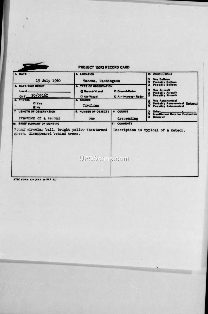 Unidentified Flying Object Report - St. Louis, Missouri, July 1960