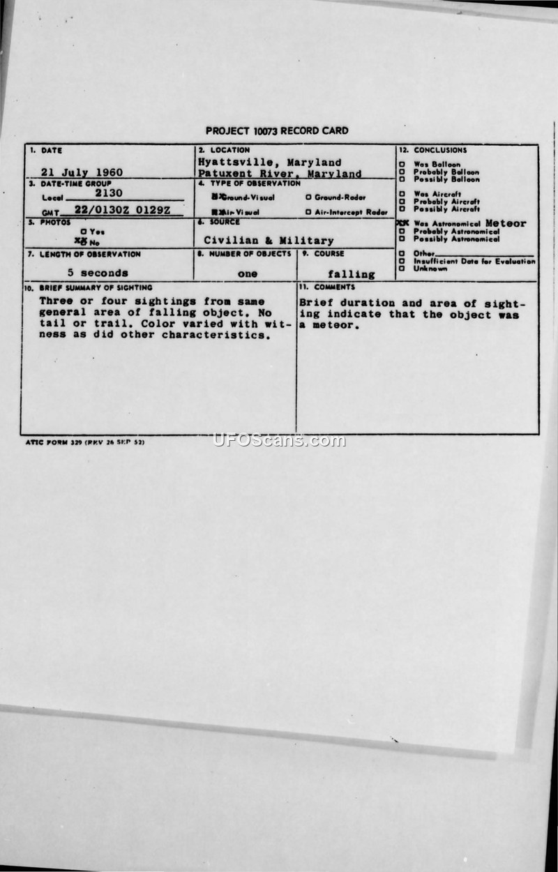 Project 10073 Record Card — Hyattsville, Maryland, 21 July 1960