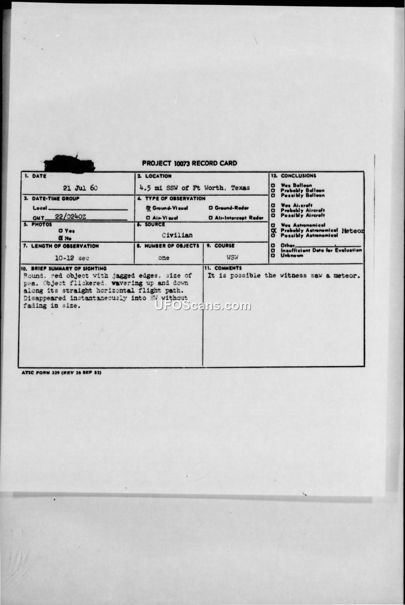 Project 10073 Record Card — 21 July 1960 Sighting, Fort Worth, Texas