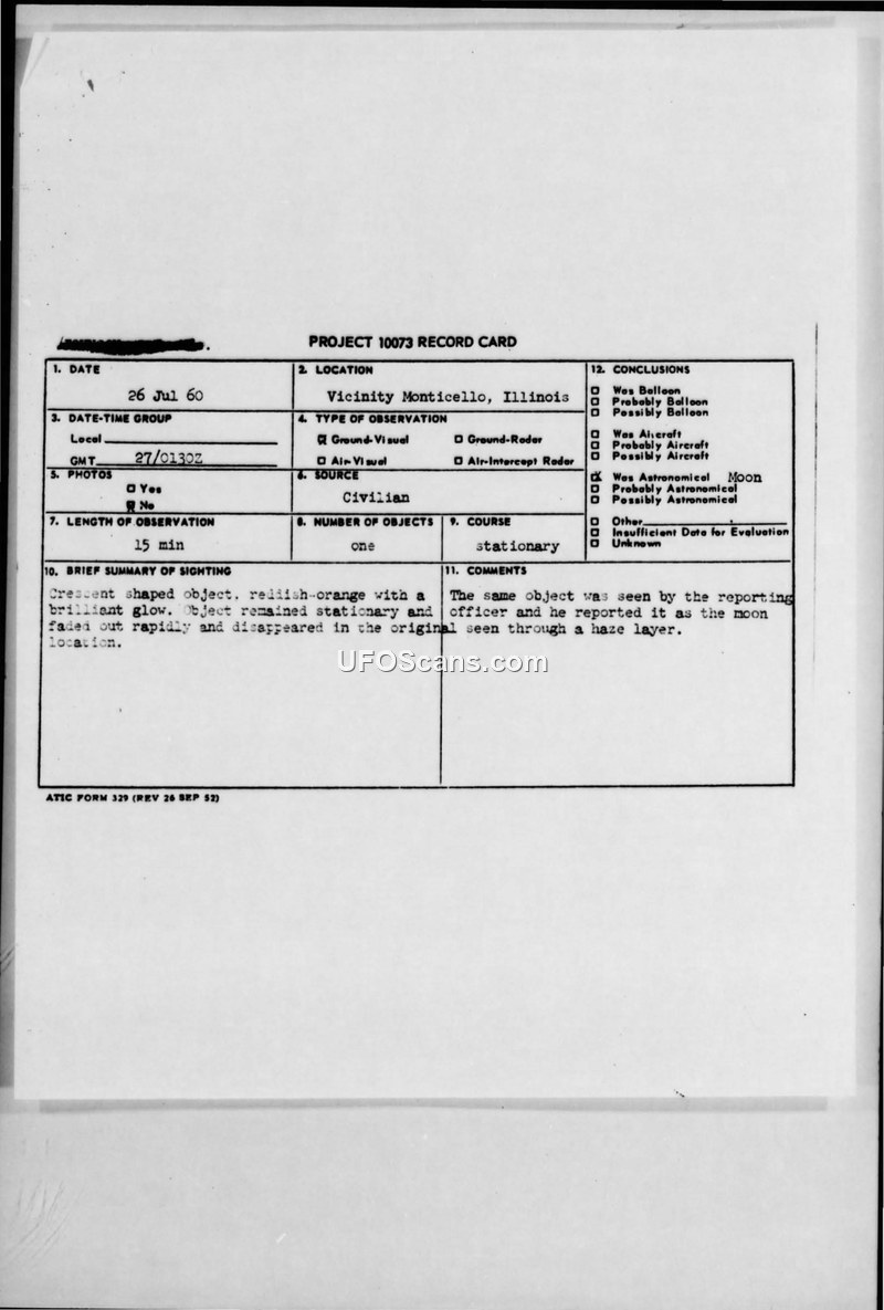 PROJECT 10073 RECORD CARD — Sighting Incident 26 July 1960, Monticello, Illinois