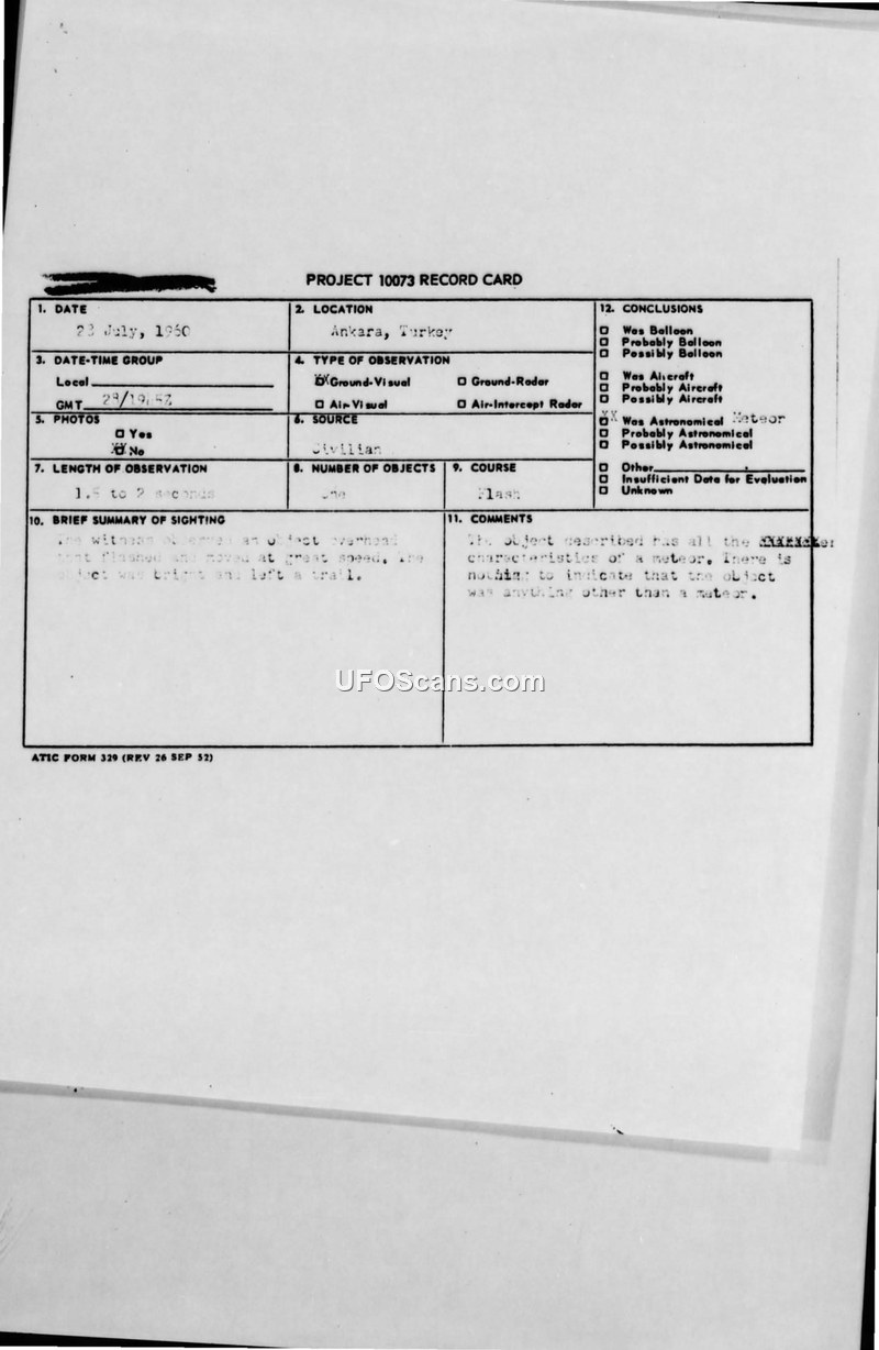 PROJECT 10073 RECORD CARD - Ankara, Turkey - 23 July 1960
