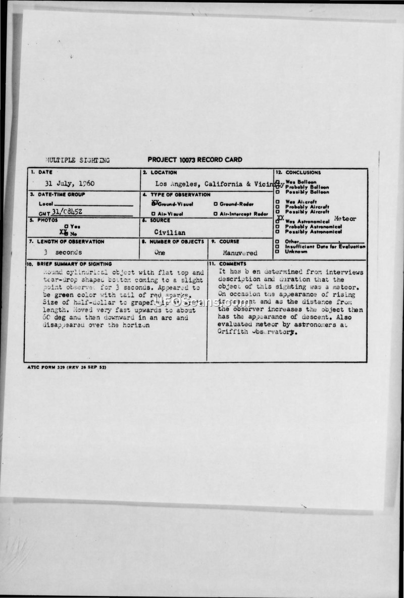 This document consists of a Project 10073 record card and subsequent correspondence from Norton Air Force Base regarding a UFO sighting that occurred on July 31, 1960, in Los Angeles, California. Multiple witnesses, including civilians and a California Highway Patrolman, reported observing a round, cylindrical object with a flat top and a tear-drop shaped bottom. The object was described as green with a tail of red sparks, appearing to be the size of a half-dollar to a grapefruit at arm's length. The witnesses reported that the object moved very fast, traveling upwards to approximately 60 degrees before descending in an arc and disappearing over the horizon. The duration of the sighting was approximately three seconds. Following the report, personnel from Norton Air Force Base interviewed the witnesses and recorded their statements on audio tape. These tapes were transcribed and filed at Base Operations. The Air Technical Intelligence Center evaluated the sighting in conjunction with astronomers from the Griffith Observatory. The official conclusion reached by the investigators was that the object was a meteor. The report notes that the perceived 'rising' motion is a common optical effect for meteors, which can appear to descend as the distance from the observer increases. Colonel G. W. [illegible] of Norton Air Force Base recommended that the case be considered closed.