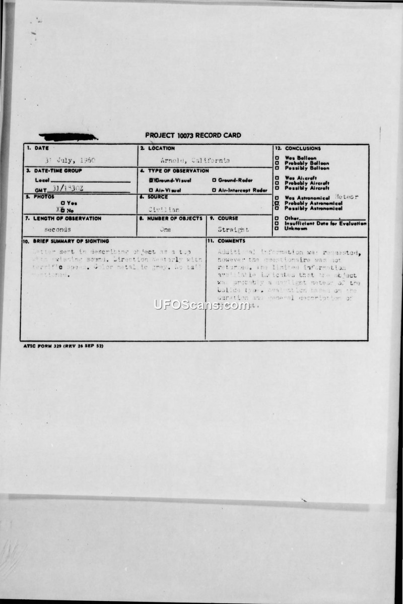 This document collection centers on a Project 10073 record card and related correspondence from August 1960 regarding a UFO sighting in Arnold, California. On July 31, 1960, a civilian witness reported observing a metallic grey, top-shaped object moving at 'terrific speed' near Kinney Lakes. The Air Force investigation, conducted by the Air Technical Intelligence Center (ATIC), concluded that the object was likely a daylight meteor, though the witness failed to return a follow-up questionnaire to provide more detailed information. The collection also includes formal correspondence from the Air Force to high-ranking officials, including Senator Richard B. Russell and Representative Carl Vinson. These letters reiterate the standard Air Force position on UFOs: that there is no authenticated evidence to suggest they are spacecraft from other planets or that they pose a direct threat to national security. The Air Force emphasizes its commitment to air defense and its duty to investigate any object in aerospace that threatens the security of the United States. Furthermore, the documents clarify that the Air Force has not concealed any classified UFO reports from Congress or the public. A significant portion of the correspondence addresses specific inquiries about alleged UFO incidents, such as a 25 July 1960 event in Atlanta, Georgia. In that instance, the Air Force clarified that the 'UFO' was actually a practice bomb that fell on the grounds of the Atlanta Federal Prison Farm, which was subsequently recovered by Explosive Ordnance Disposal personnel. The documents also provide a list of sightings from August 1 to August 20, 1960, categorizing various reports as meteors, aircraft, satellites, or instances of insufficient data. The collection serves as a record of the administrative and public relations efforts undertaken by the Air Force to address UFO inquiries during the summer of 1960, maintaining a consistent stance that such phenomena are either explainable natural events or conventional objects, while simultaneously seeking to advance scientific and industrial technology.