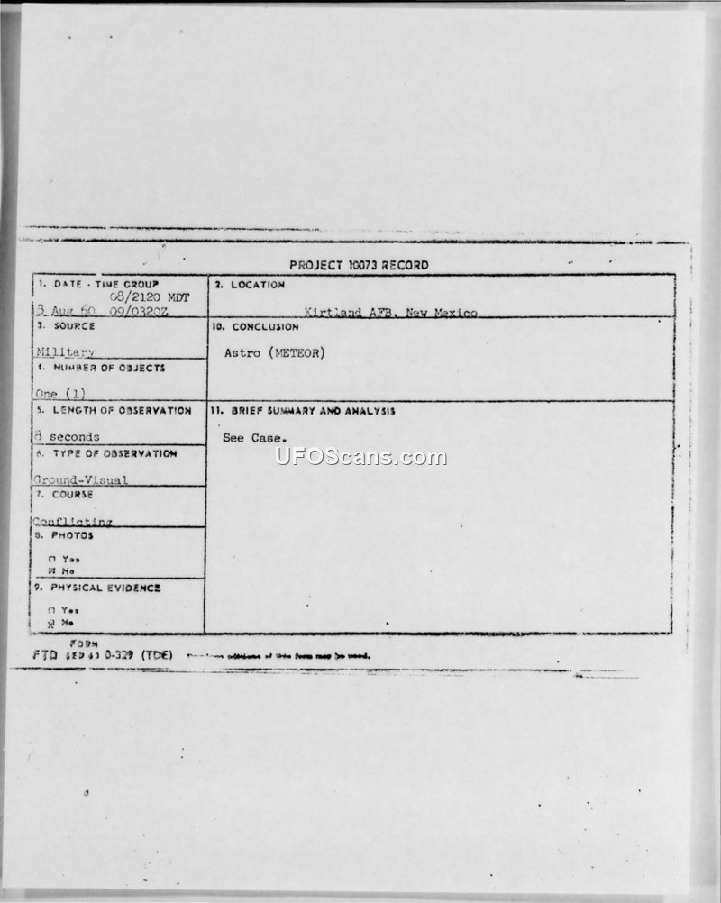 A sighting of a fireball-like object at Kirtland AFB on August 9, 1969, was investigated by Air Police and officially categorized as a meteor. Despite reports of a potential impact, searches by both military and civil defense personnel yielded no physical evidence.