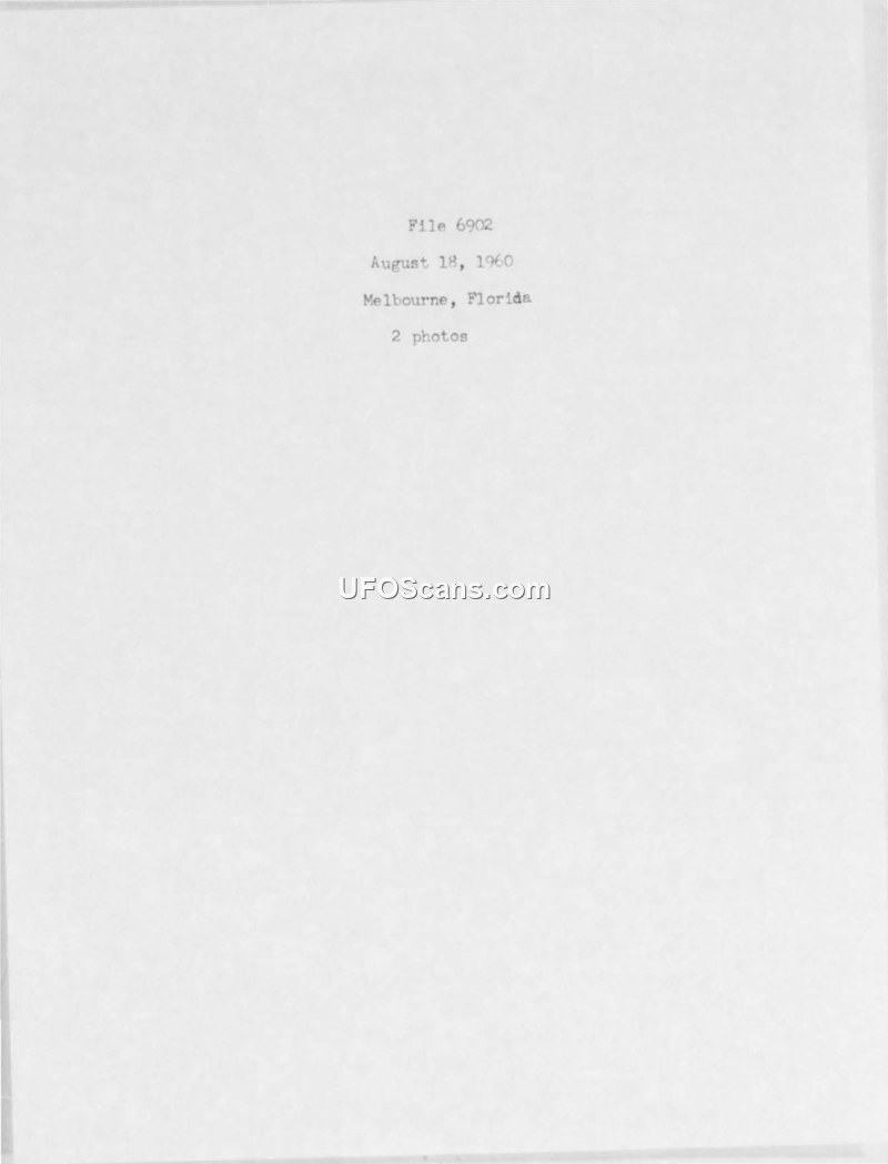 File 6902 contains two photographs dated August 18, 1960, from Melbourne, Florida. The images show an unidentified object consisting of a central block wrapped in white material with a pipe running through it.