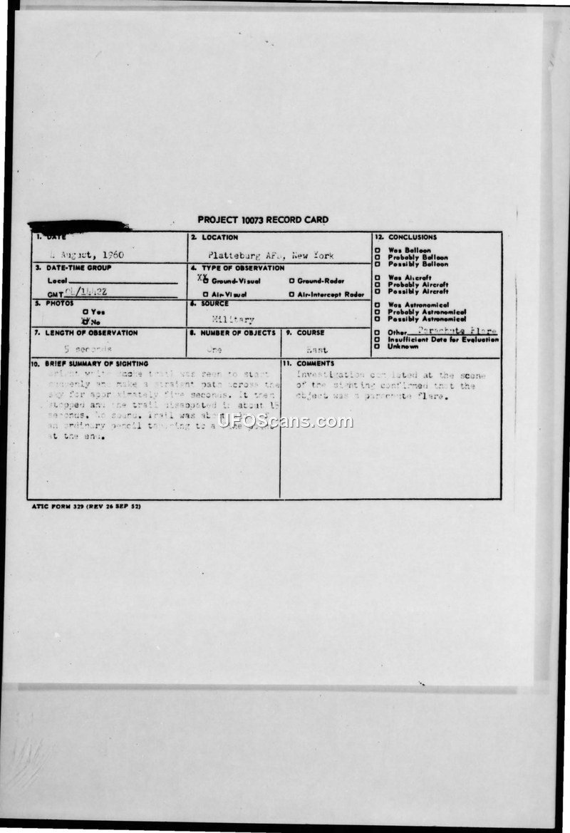 Project 10073 Record Card — Plattsburgh AFB, New York, 4 August 1960