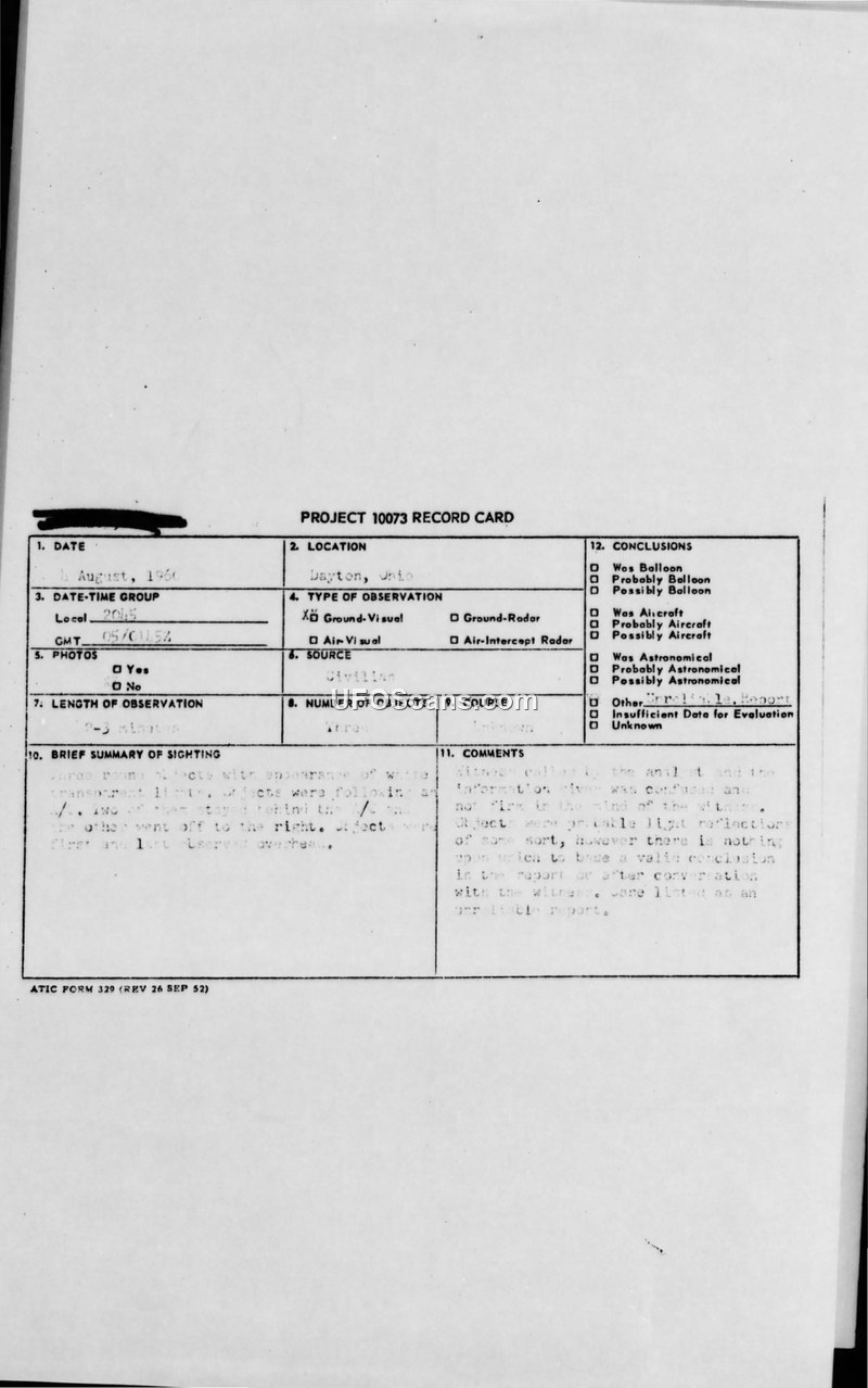 Project 10073 Record Card — August 1960 Sighting, Dayton, Ohio