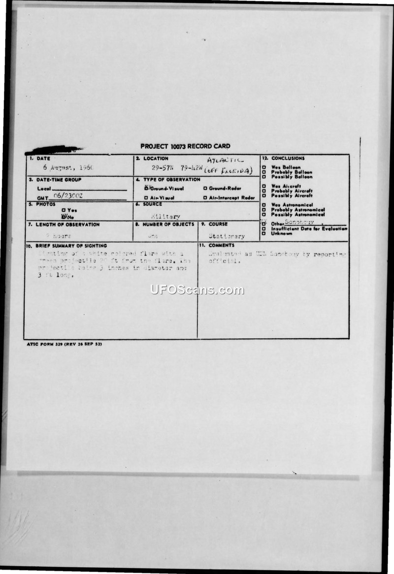 This document consists of a Project 10073 record card and associated military teletype messages regarding an aerial sighting on August 6, 1960. The incident occurred in the Atlantic Ocean off the coast of Florida at coordinates 29-57N 79-42W. The report describes the observation of a white flare accompanied by a green projectile located approximately 20 feet from the flare. The projectile was estimated to be three inches in diameter and three feet long. The observation lasted for two hours, during which the object remained stationary. The report notes that the sighting was relayed by Coast Guard Seven and involved the ASW Force Jacksonville, which was conducting a search in the area. The official evaluation provided in the record card and the teletype messages identifies the object as a US Navy sonobuoy. The documentation includes internal Air Force staff message logs, confirming the transmission of the report between various military commands, including the 32nd NORAD Division and the Air Technical Intelligence Center at Wright-Patterson Air Force Base.