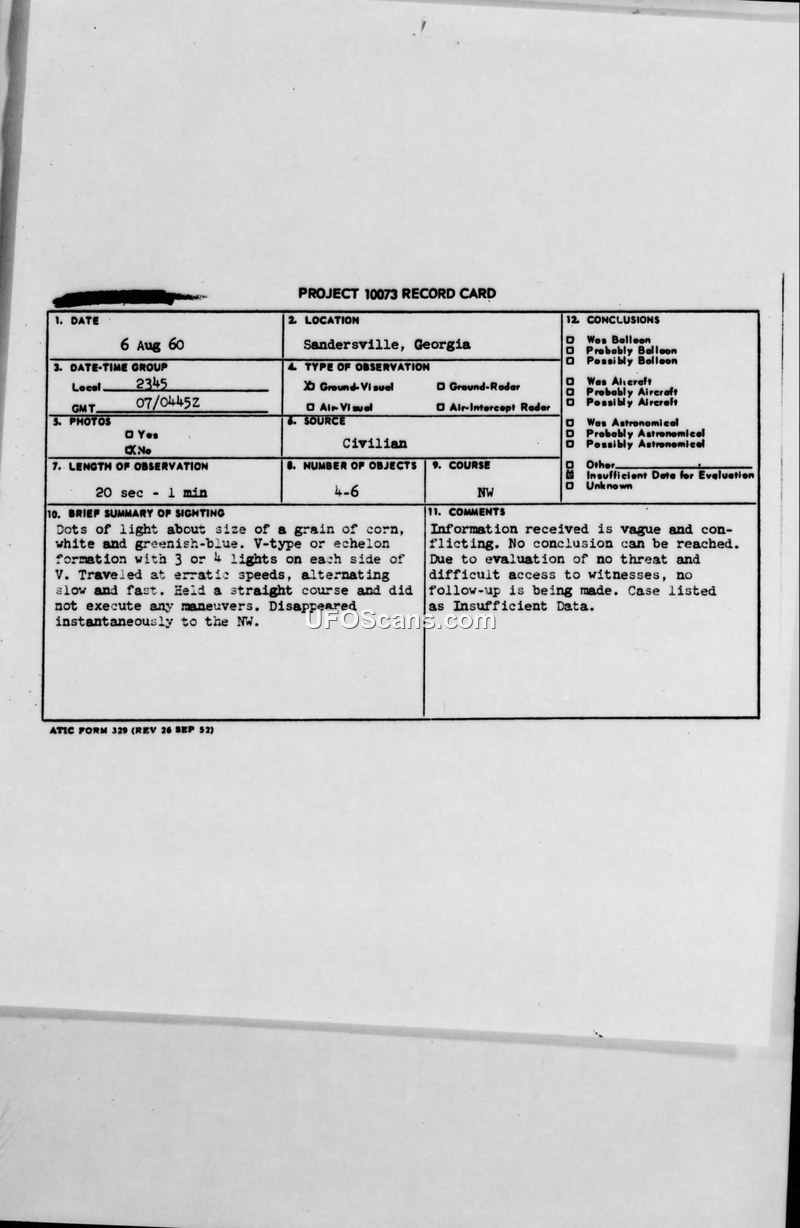 This document contains the official record and subsequent investigation of a UFO sighting reported on August 6, 1960, near Sandersville, Georgia. The initial report was received by Major J. E. Edwards at Warner-Robbins AFB, who relayed the information to the Air Technical Intelligence Center (ATIC). The sighting involved four to six objects described as dots of light, approximately the size of a grain of corn, exhibiting a white and greenish-blue color. The witnesses reported that the objects appeared in a V-type or echelon formation, moving at erratic speeds—alternating between slow and fast—while maintaining a straight course without executing maneuvers. The objects were observed for a duration estimated between 20 seconds and one minute before disappearing instantaneously to the northwest. The investigation was conducted by the 2853D Air Base Wing in accordance with AFR 200-2. The investigating officer, Captain Mitchel, interviewed the witnesses, but the resulting information was deemed vague and conflicting. The official conclusion reached by the military was that the case provided 'Insufficient Data.' The report explicitly notes that there was no physical evidence, such as photographs, and no radar contact. Furthermore, the investigating officer remarked that the reported 'blinking lights' did not meet the criteria for a UFO as defined by Air Force regulations at the time. Due to the lack of a perceived threat and the difficulty in obtaining further information from the witnesses, the case was closed without further follow-up.