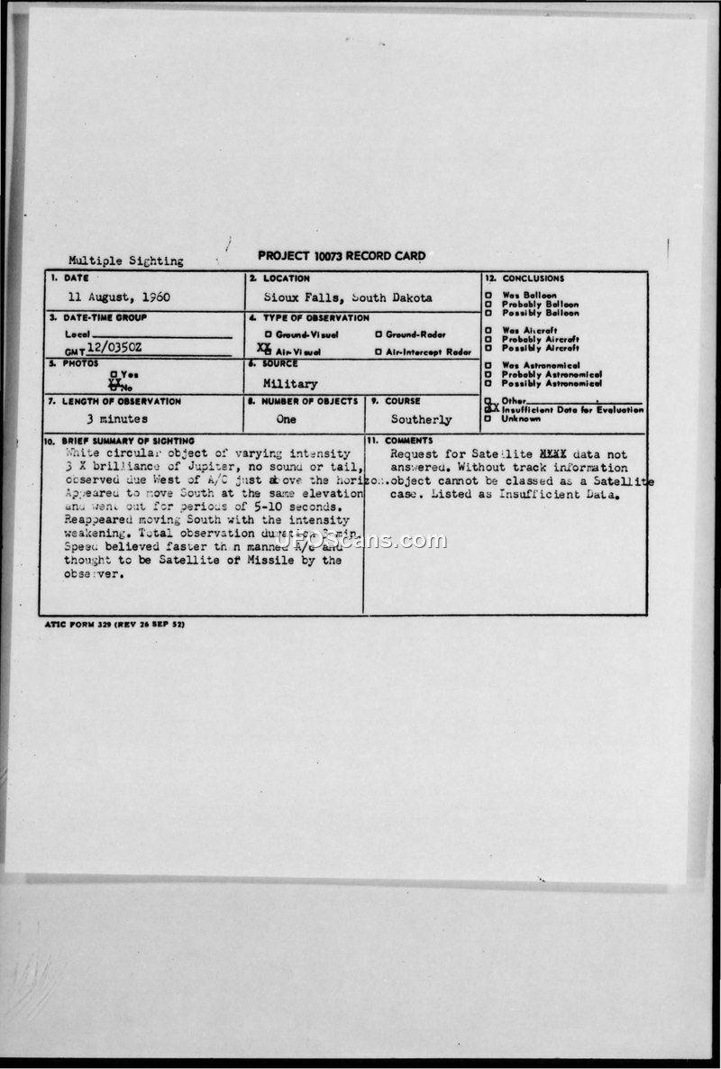 PROJECT 10073 RECORD CARD — Sighting Report, Sioux Falls, South Dakota, 11 August 1960