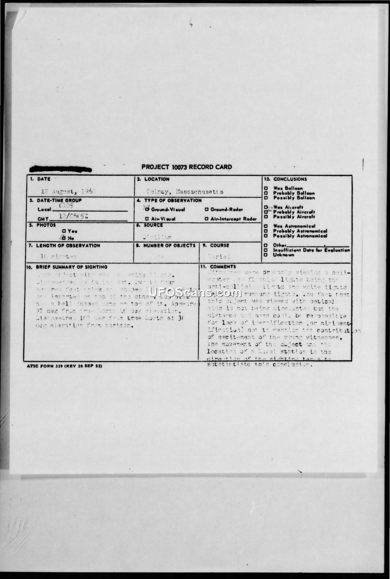 A group of six witnesses in Quincy, Massachusetts, reported a metallic, plate-shaped object with red and white lights on August 12, 1960. The Air Force concluded the object was likely a helicopter, citing the anti-collision lights and the proximity to a naval station.