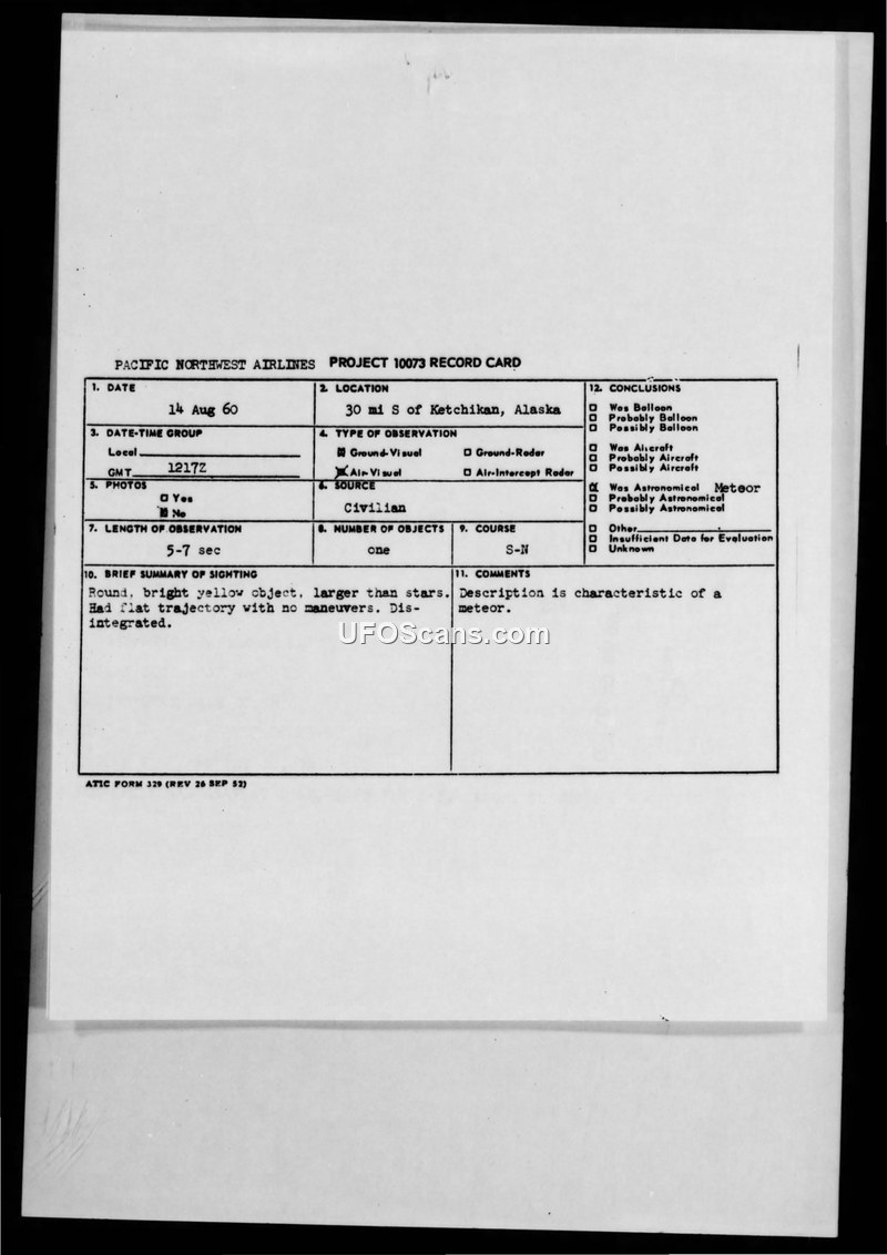 This document is a Project 10073 record card and associated teletype communication regarding an aerial sighting reported by a Pacific Northwest Airlines crew on August 14, 1960. The incident occurred at 1217Z, approximately 30 miles south of Ketchikan, Alaska. The witness, operating a DC-6 aircraft, observed a round, bright yellow object that appeared larger than stars. The object was seen at an altitude of two degrees above the horizon and followed a flat trajectory with no maneuvers for a duration of five to seven seconds before it disintegrated. The weather conditions at the time were reported as clear. The official conclusion reached by the evaluating agency, ATIC, was that the object was an astronomical meteor, noting that the description provided by the witness was characteristic of such an event. The documentation includes a teletype message (RUNDAG 73) sent from AAC INT to various military commands, including the Air Force, and a copy was directed to Dr. Hynek.