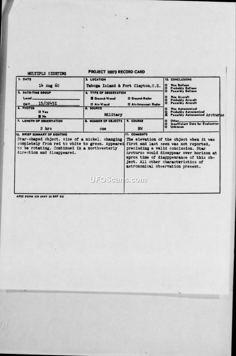 Project 10073 Record Card: Multiple Sighting, Taboga Island & Fort Clayton, C.Z.