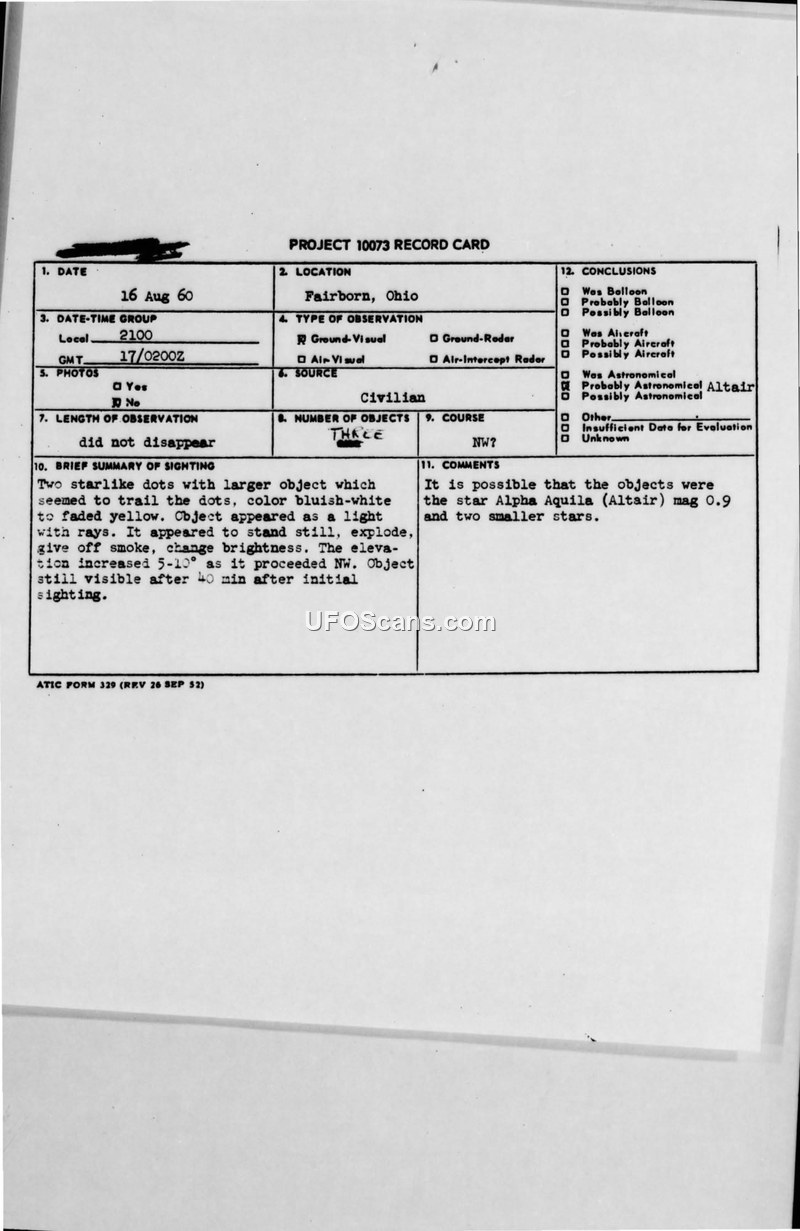 A civilian in Fairborn, Ohio, reported three starlike objects on August 16, 1960, which exhibited movement and brightness changes. The Air Force investigation concluded the objects were likely the star Altair and two smaller stars.