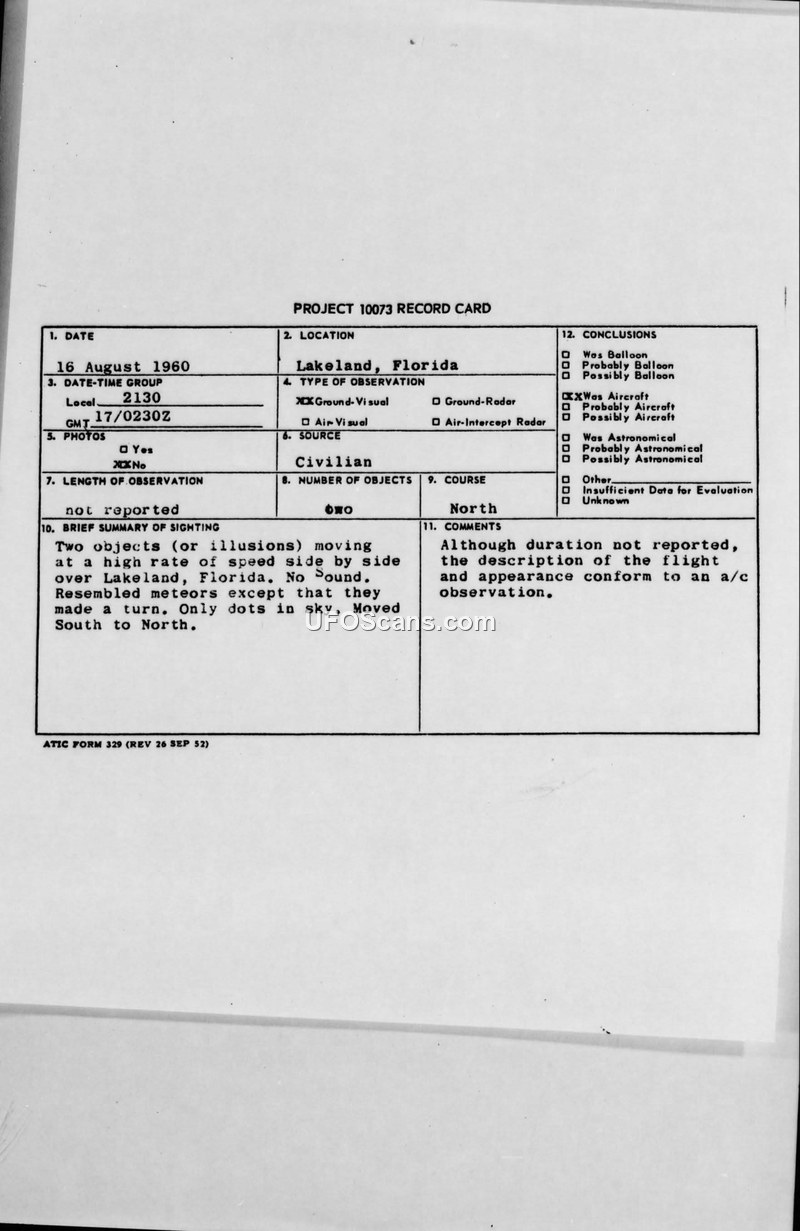 PROJECT 10073 RECORD CARD - Lakeland, Florida - 16 August 1960