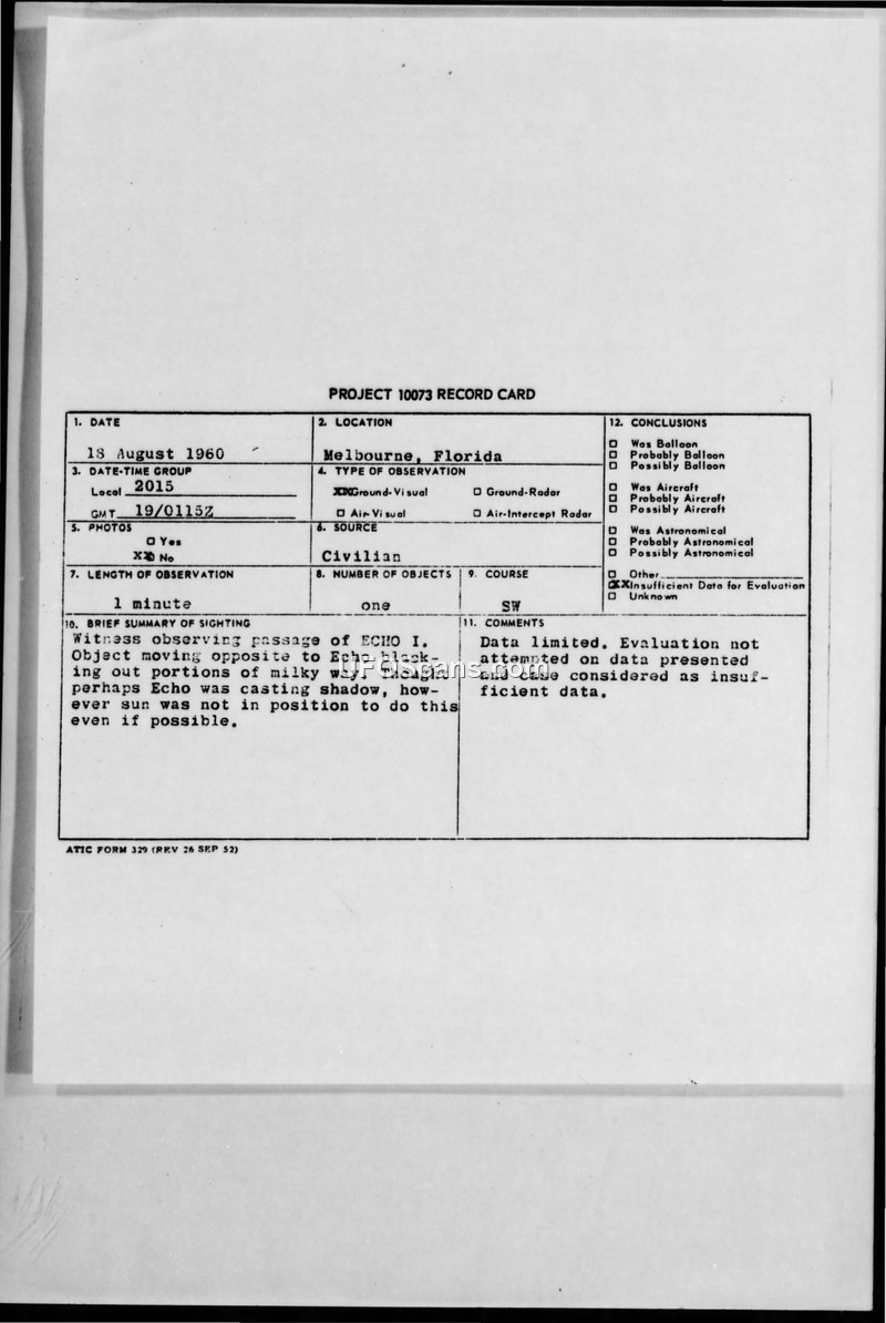 Project 10073 Record Card and Related Correspondence — Melbourne, Florida, August 1960