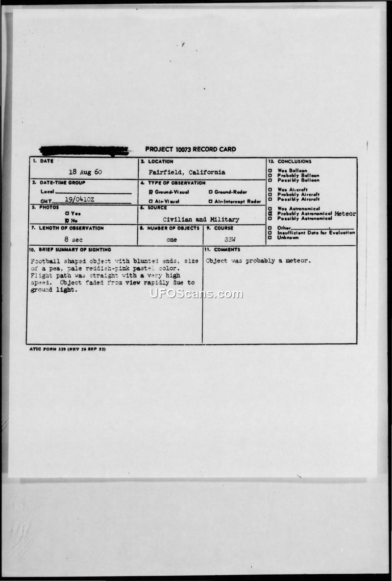 Project 10073 Record Card — Sighting Report, Fairfield, California, 18 Aug 60