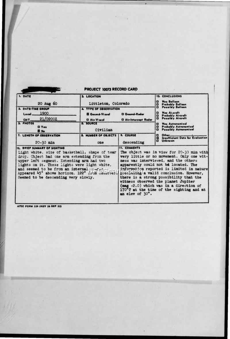 This document contains a Project 10073 Record Card detailing a UFO sighting in Littleton, Colorado, on August 20, 1960. The witness reported a light-white, basketball-sized, tear-drop-shaped object with an extending arm featuring two lights. The object was observed for 20 to 30 minutes, appearing to descend very slowly. The official conclusion reached by the Aerospace Technical Intelligence Center (ATIC) was that the sighting was likely the planet Jupiter, which was visible at the time in the reported direction and elevation. The file also includes extensive supplementary documentation regarding other sightings in the region, specifically in Red Bluff, California, during August 1960. These reports involve multiple witnesses, including California Highway Patrol officers, who observed large, oblong, glowing objects with red and white lights. The Air Force investigated these reports, attributing them to temperature inversions causing the refraction of common objects, such as the planet Mars. The file contains correspondence between the Air Force and private organizations like the Aerial Phenomena Research Organization (APRO) and the National Investigations Committee on Aerial Phenomena (NICAP), as well as internal military communications regarding the investigation of these events. The documentation highlights the Air Force's efforts to coordinate with local authorities and weather services to provide rational explanations for the reported phenomena, while also noting the limitations of the data provided by witnesses.