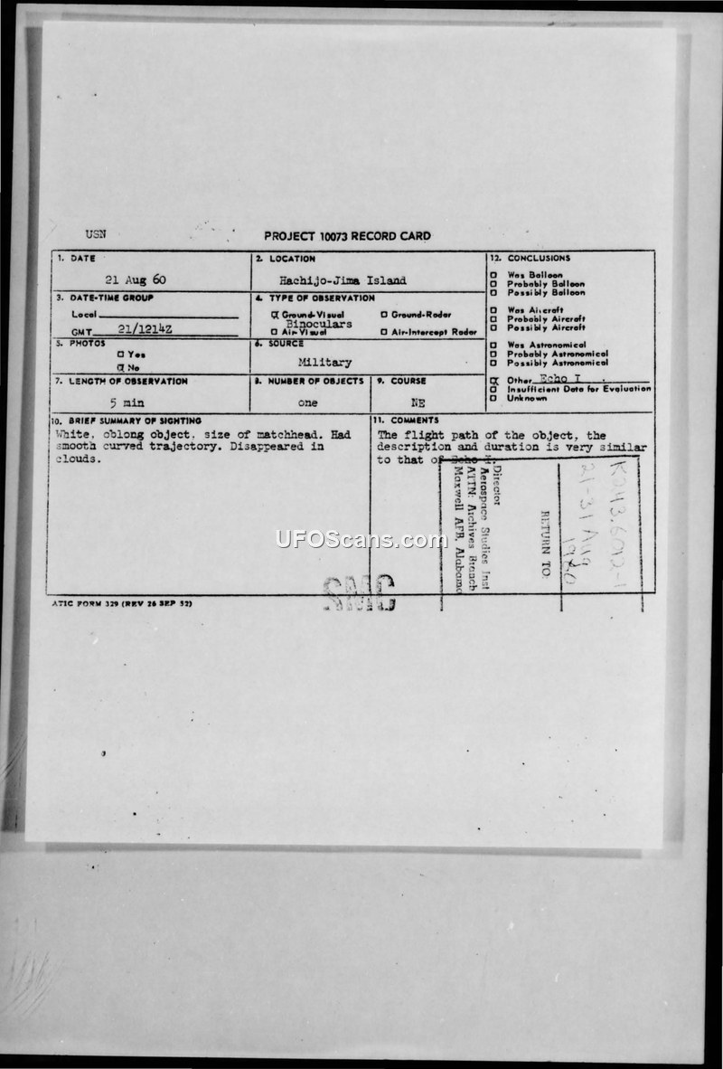 Project 10073 Record Card — Hachijo-Jima Island, 21 August 1960