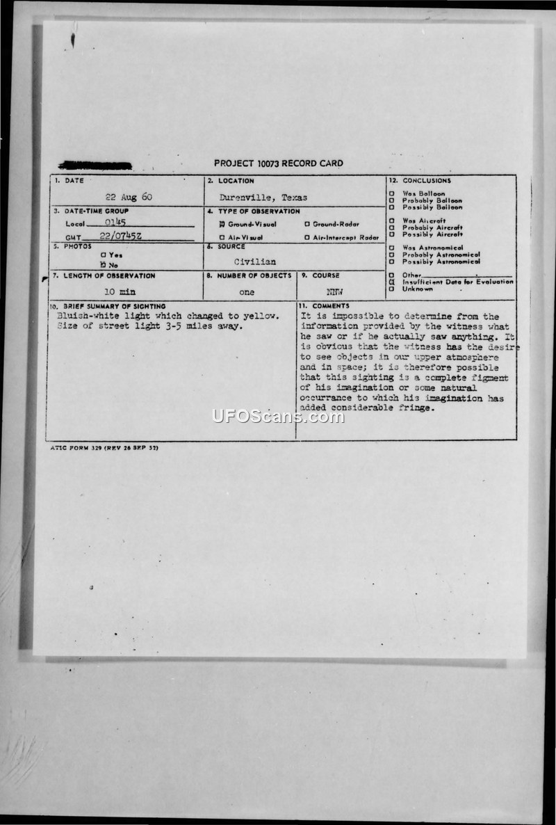 This document contains the official record and correspondence regarding a UFO sighting reported by a civilian on 22 August 1960, near Durenville, Texas. The witness, an amateur astronomer who possessed a 3-inch refractor telescope, reported observing a bluish-white light that changed to yellow, which he estimated to be the size of a street light at a distance of 3 to 5 miles. The object was observed for approximately 10 minutes, moving from a north-northeasterly direction to an overhead position. The witness initially reported his observation to the Harvard College Observatory, which subsequently forwarded the information to the Aerospace Technical Intelligence Center (ATIC) via Spacetrack. The witness provided detailed, albeit subjective, accounts of the object's behavior, comparing it to the brightness of Sirius and noting its motion relative to celestial bodies. He also speculated that the object could have been a Soviet rocket or a satellite. The official Air Force evaluation of the report was highly skeptical. Investigators concluded that it was impossible to determine if the witness had actually observed anything at all. The report explicitly states that the witness appeared to have a strong desire to see objects in the upper atmosphere and space, leading the evaluators to conclude that the sighting was likely a 'complete figment of his imagination' or a natural occurrence embellished by his imagination. The file includes the original Project 10073 record card, the technical information sheet completed by the witness, and various pieces of correspondence between the witness, the Harvard College Observatory, and the Air Force's Public Information Division. The correspondence highlights the administrative process of handling such reports, with the Air Force requesting that the witness complete formal questionnaires to facilitate further analysis, while simultaneously dismissing the validity of the initial report. The witness's own notes and sketches, which include detailed star charts and descriptions of the object's movement, are preserved in the file, providing a contrast to the dismissive official conclusion.