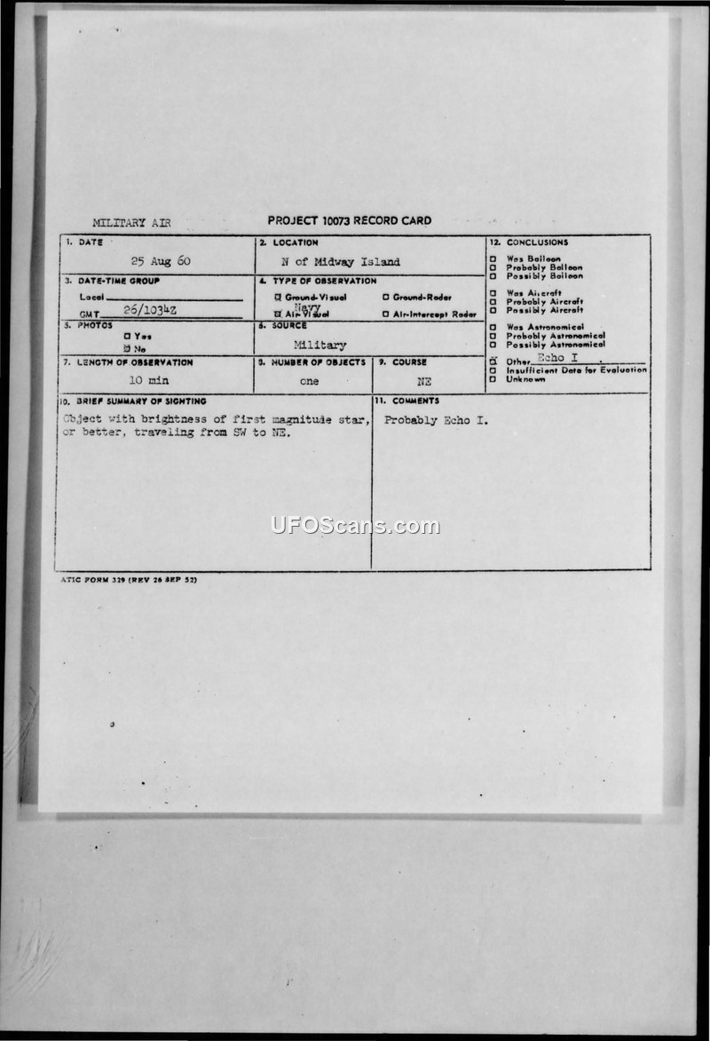 A sighting of a bright object north of Midway Island on 25 August 1960 was reported by the USS Higbee. The object was officially evaluated by ATIC as likely being the Echo I satellite.