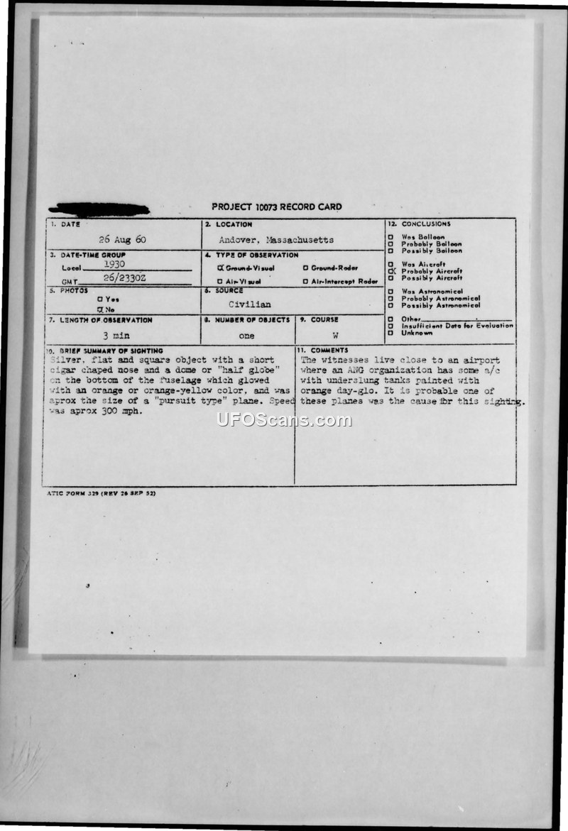 A civilian in Andover, Massachusetts, reported a UFO sighting on August 26, 1960. The Air Force concluded the object was likely an Air National Guard F-86H aircraft with orange day-glo fuel tanks.
