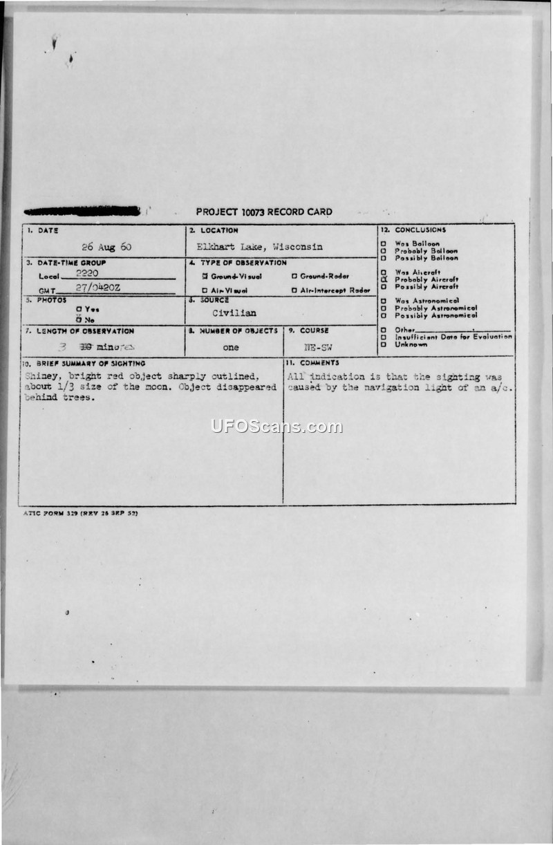 Two 12-year-old witnesses reported a red, circular object in Elkhart Lake, Wisconsin, on August 26, 1960. The Air Force concluded the sighting was likely the navigation light of an aircraft.