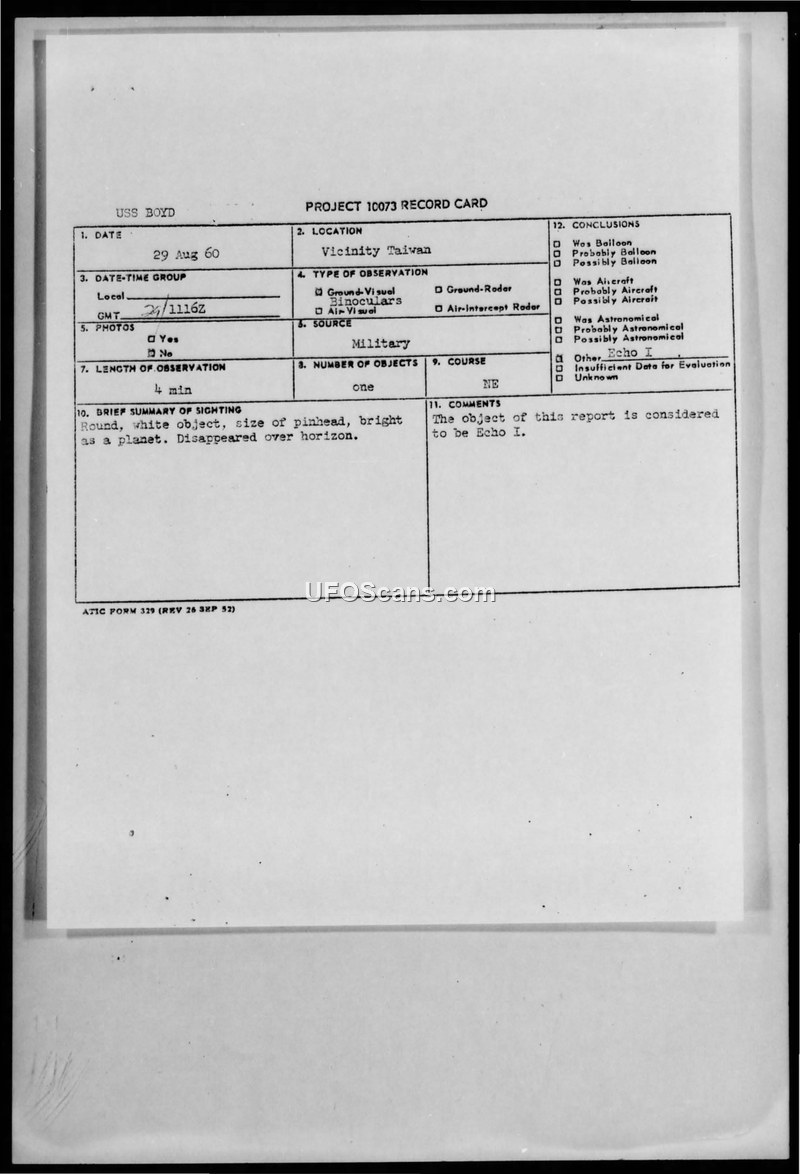 A sighting of a bright, round object by the USS Boyd near Taiwan on August 29, 1960, was officially identified by the Air Technical Intelligence Center as the Echo I satellite.