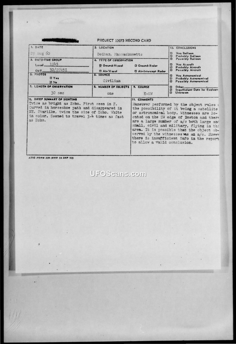 A 1960 sighting report from Dedham, Massachusetts, describes a fast-moving, star-like object. The Air Technical Intelligence Center concluded the report was inconclusive due to insufficient data, despite noting the object's maneuverability.
