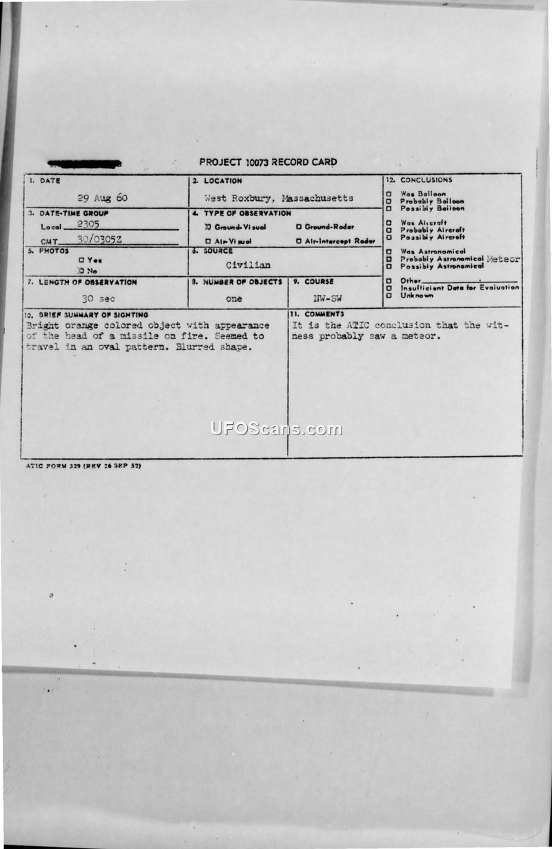 A civilian reported a bright orange, missile-like object in West Roxbury, Massachusetts, on August 29, 1960. The Air Technical Intelligence Center concluded the object was a meteor.