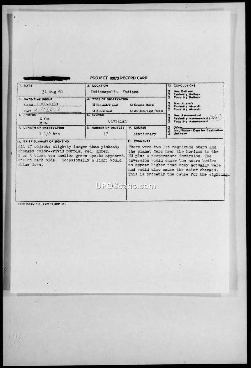 A 1960 UFO sighting in Indianapolis involving 17 objects was officially attributed to astronomical phenomena distorted by a temperature inversion. The report includes witness testimony and internal Air Force communications regarding the event.