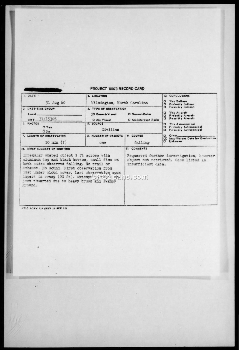 Project 10073 Record Card and Incident Report — Wilmington, North Carolina, 31 August 1960