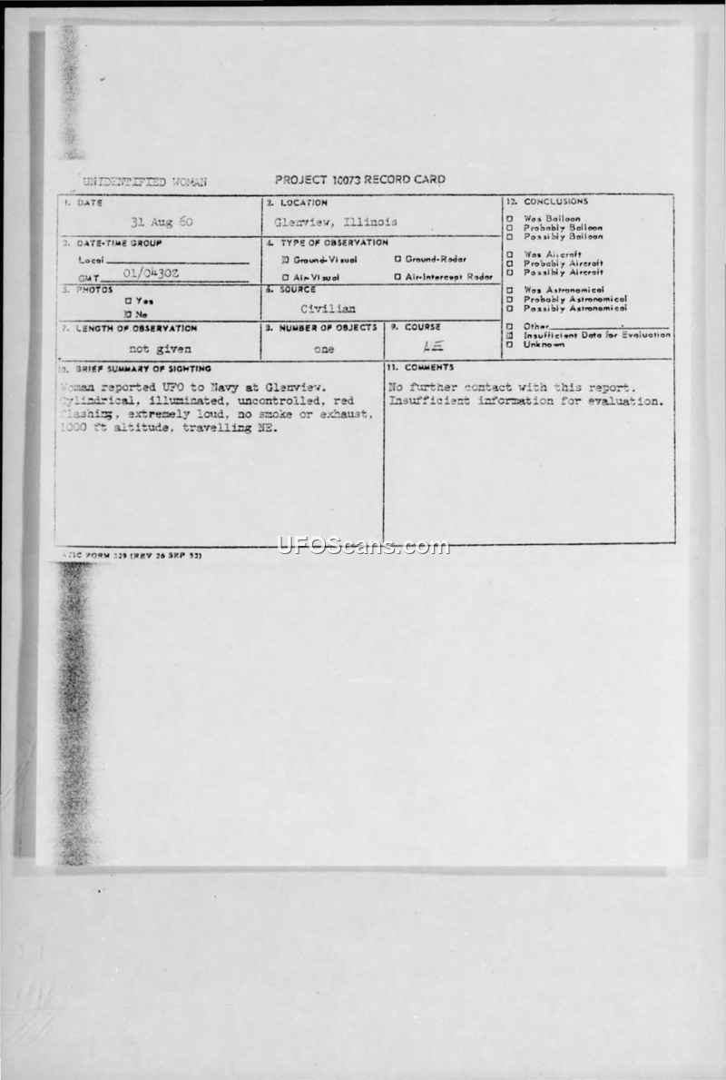 A civilian reported a cylindrical, loud, red-flashing UFO over Glenview, Illinois, on 31 August 1960. The Air Force concluded there was insufficient data to evaluate the incident and took no further action.