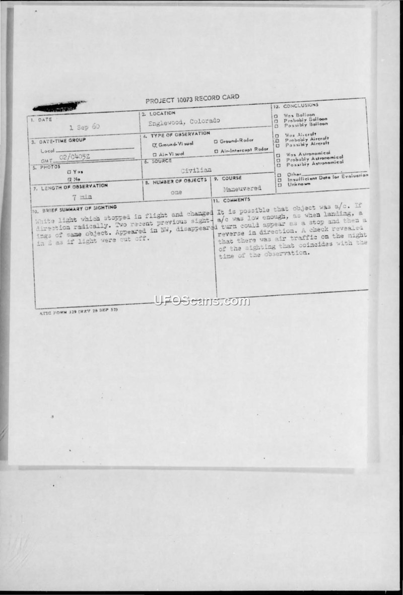 This document collection details a UFO sighting reported on September 2, 1960, in Englewood, Colorado. The primary witness, a civilian accompanied by his wife and brother, observed a white light that appeared to stop in flight and change direction radically. The object was reported to have appeared in the northwest, passed overhead at approximately 3,000 feet, and disappeared in the east over a duration of seven minutes. The report was processed under Project 10073. Following the initial report, the Aerospace Technical Intelligence Center (ATIC) requested further clarification from Lowry Air Force Base regarding the object's elevation, azimuth, and flight path, as well as a check for any aircraft or balloons in the area. The subsequent investigation by the Airdrome officer at Lowry AFB concluded that the sighting was likely an aircraft. Specifically, it was determined that a T-33 aircraft was landing at Lowry AFB at the time of the observation. The officer noted that the aircraft's landing pattern and the 45-degree approach to the initial point would cause the landing lights to appear to stop and move erratically from the observer's perspective. Furthermore, it was noted that the observer had reported similar sightings of aircraft landing lights on previous occasions. The documentation includes the original record card, internal military message traffic between Lowry AFB, the Aerospace Technical Intelligence Center, and other commands, and a final summary of the findings.
