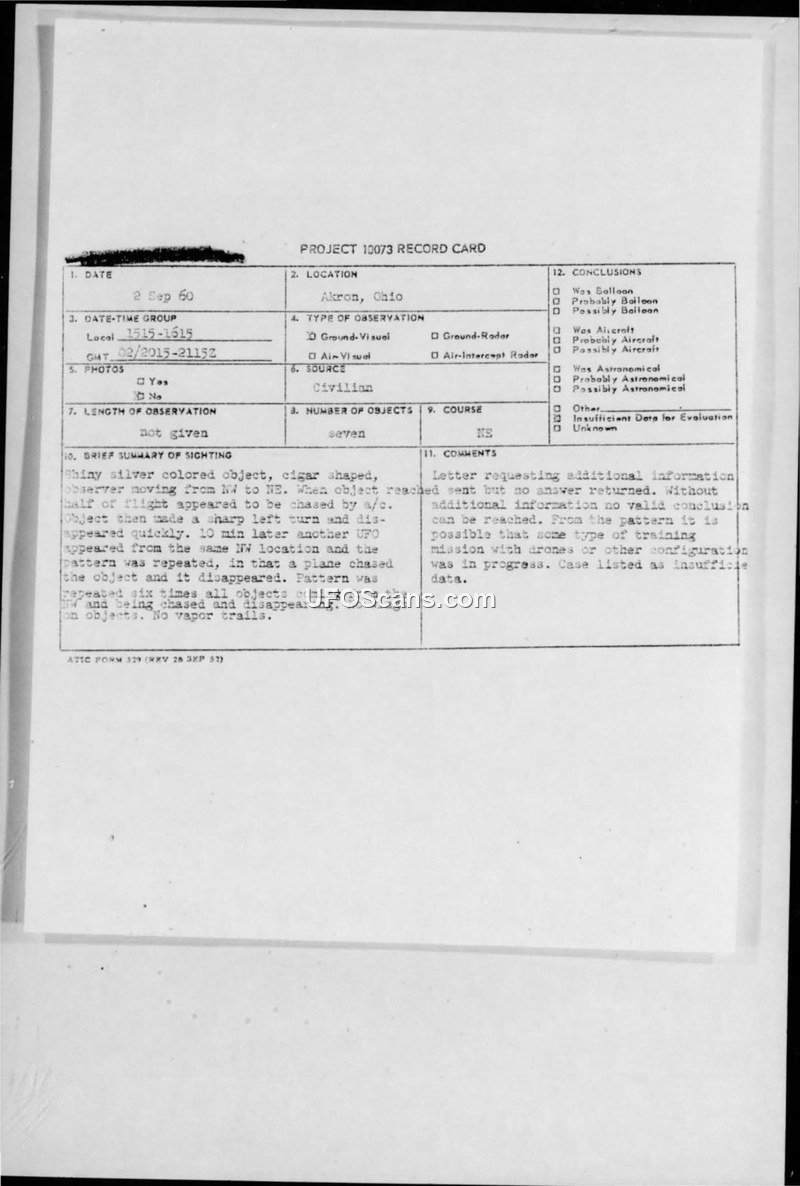A civilian reported seven cigar-shaped objects in Akron, Ohio, on September 2, 1960. The Air Force closed the case as 'insufficient data' after the witness failed to return requested questionnaires.