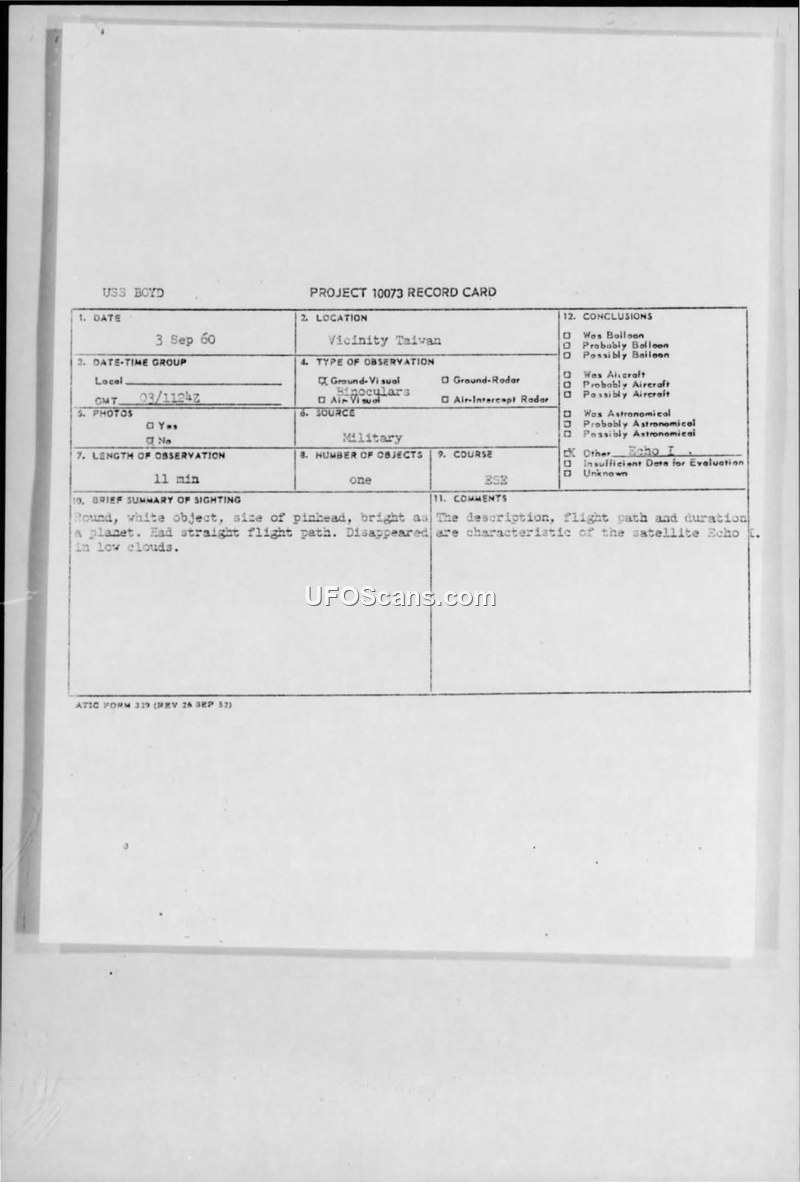 A 1960 sighting report from the USS BOYD near Taiwan describes a bright, round object observed for 11 minutes. The object was officially identified by the Air Technical Intelligence Center as the Echo I satellite.