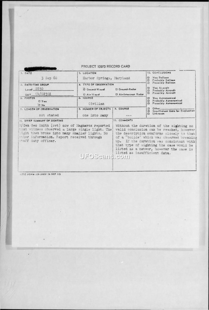 This document consists of a Project 10073 record card and an accompanying duty officer's report from the Aerospace Technical Intelligence Center (ATIC) at Wright-Patterson Air Force Base. The report details a sighting that occurred on September 3, 1960, at 2230 hours in Harbor Springs, Maryland. The witness, identified as retired Major General George F. Smith of the Magnavox Corporation, reported observing a large, single light that subsequently broke into many smaller lights. The report was relayed to ATIC by Lieutenant Colonel Workman of AMCSDO, based on an earlier report from Captain Saltsman dated September 4, 1960. The official evaluation of the incident concluded that there was insufficient data to reach a definitive conclusion. The investigators noted that while the description of the object breaking up closely resembled that of a bolide (a type of meteor), the lack of information regarding the duration of the sighting prevented a formal classification as such. Consequently, the case was officially filed under the category of insufficient data for evaluation.