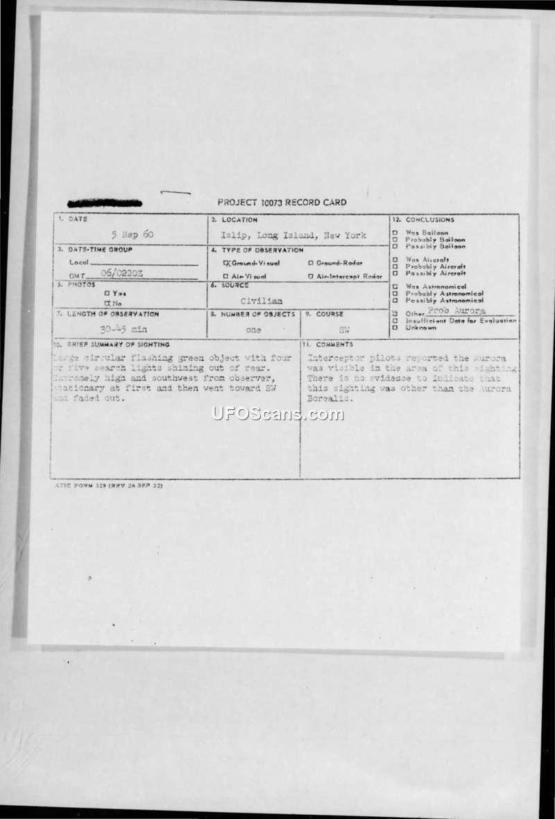 Project 10073 Record Card — Islip, Long Island, New York, 5 Sep 60