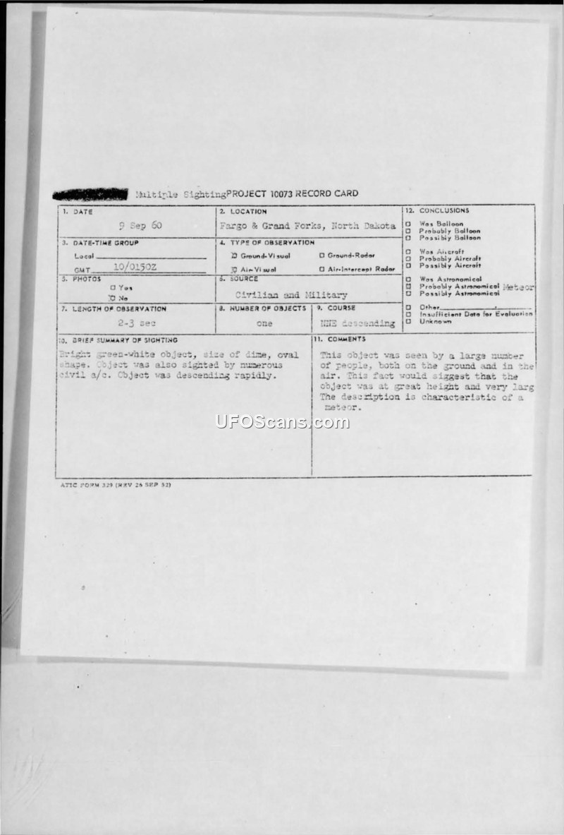A bright green-white oval object was sighted over North Dakota on September 9, 1960, by multiple reliable witnesses including air traffic controllers and pilots. Intelligence officers concluded the object was likely a large meteorite.
